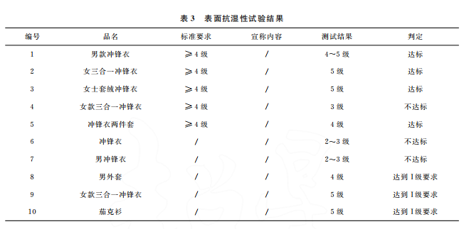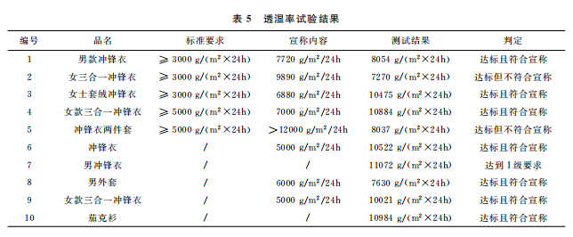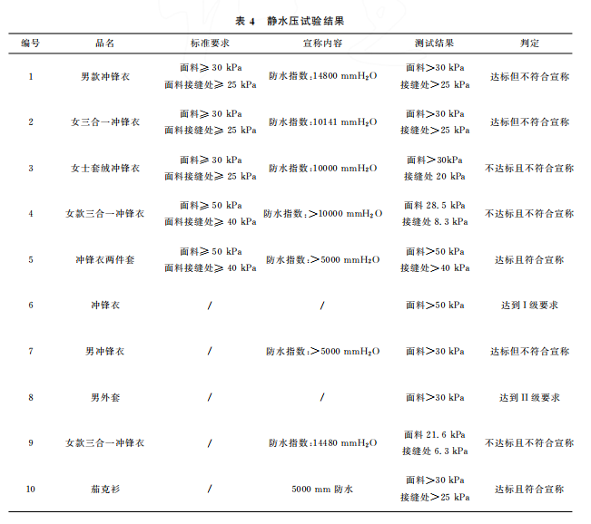 本文最終的判定是結合 GB/T32614—2016《戶外運動服裝 沖鋒衣》中面料功能性要求和產品銷售時的吊牌宣稱進行。達標是指符合沖鋒衣的合格品 標 準 要 求,反 之 則 不 符 合。10 件 樣 品中,只有5件達標,且只有3件是符合吊牌宣稱內容。其中,標示了 GB/T32614—2016的沖鋒衣,有3件達標,合格率為60%。近年來,監(jiān)管部門的抽查合格率一般在80%左右。這次比較試驗合格率偏低的原因可能是樣品量較少,樣品的價格區(qū)間比較集中,且考核了接縫處的靜水壓。值得注意的是有2件沒有標示 GB/T32614—2016的外套,其性能都符合標準要求。此外,銷售方對靜水壓的宣稱都偏高,有3件達標了卻不符合自身的宣稱內容。沖鋒衣 GB/T32614—2016標準 中 I級 對 靜 水 壓 的 要 求 也 只是:面料≥50kPa和面料接縫處≥50kPa,銷售 方卻往往宣稱100kPa,甚至達150kPa,而且也沒有充分考慮到面料接縫處靜水壓值會相對偏小的現實。需要警 醒 的 是,5 件 標 示 了 GB/T32614—2016的沖鋒衣其綜合宣傳都不符合規(guī)定,存在執(zhí)行標準標注正確卻夸大宣傳的嫌疑。