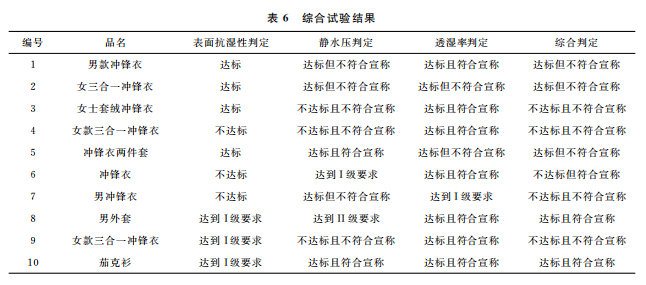 表面抗?jié)裥?、靜水壓和透濕率綜合統(tǒng)計的測試結果見表6。