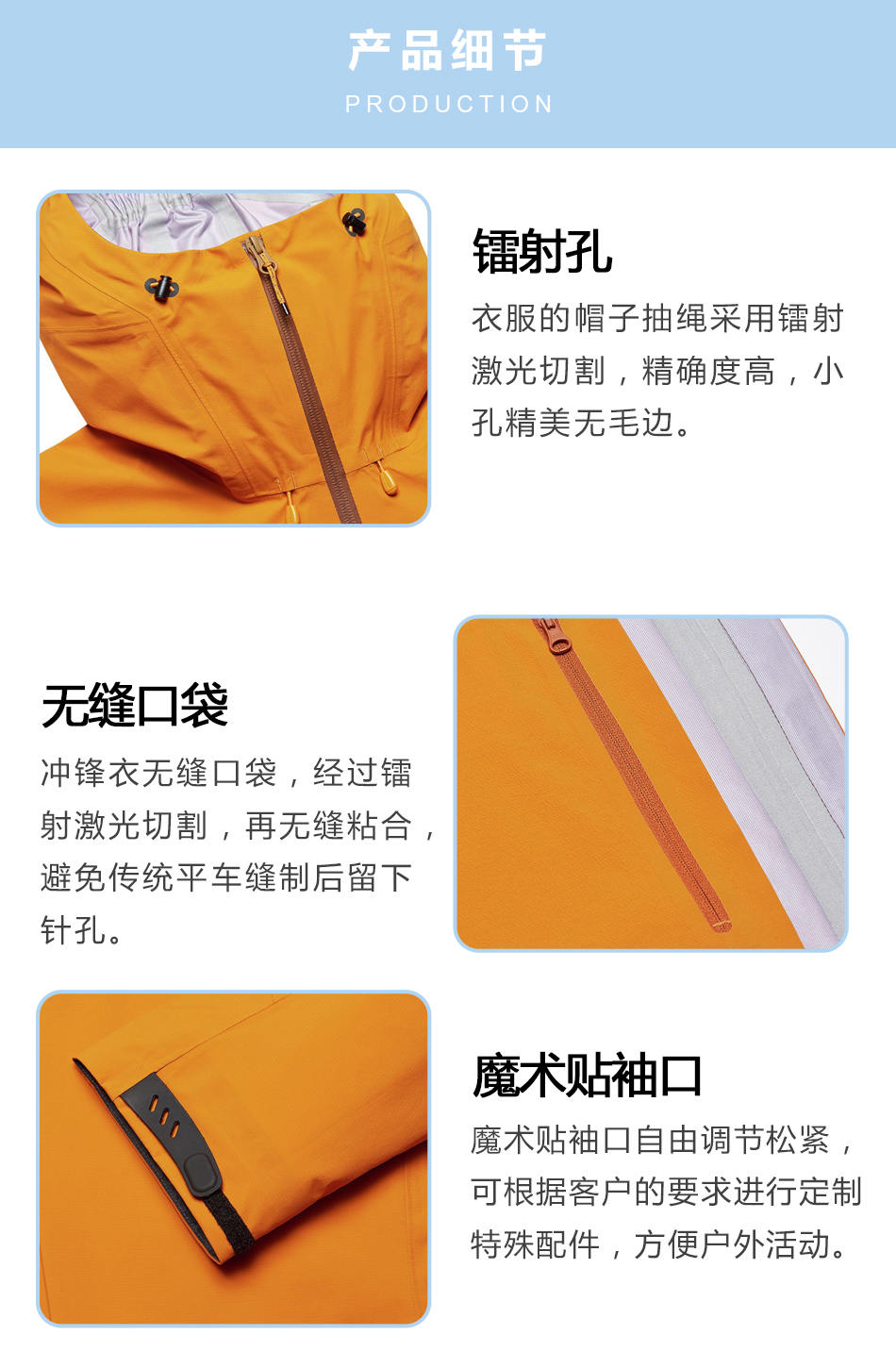 無縫口袋:沖鋒衣無縫口袋,經(jīng)過鐳射激光切割,再無縫粘合,避免傳統(tǒng)平車縫制后留下針孔。