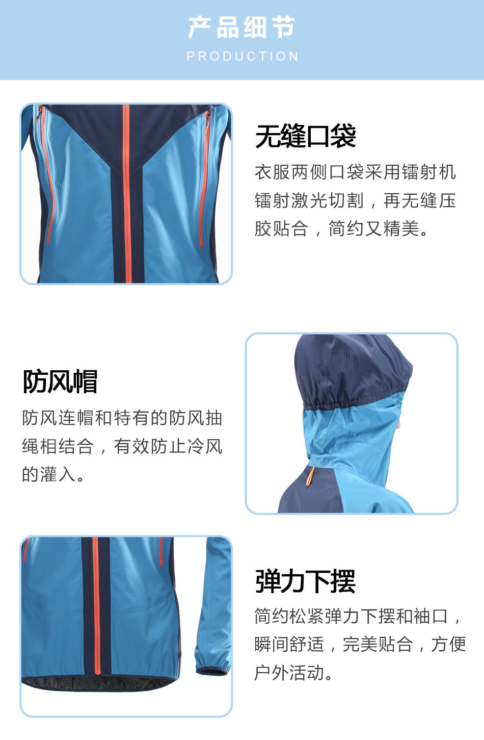 彈力下擺:簡(jiǎn)約松緊彈力下擺和袖口,瞬間舒適,完美貼合,方便戶外活動(dòng)。