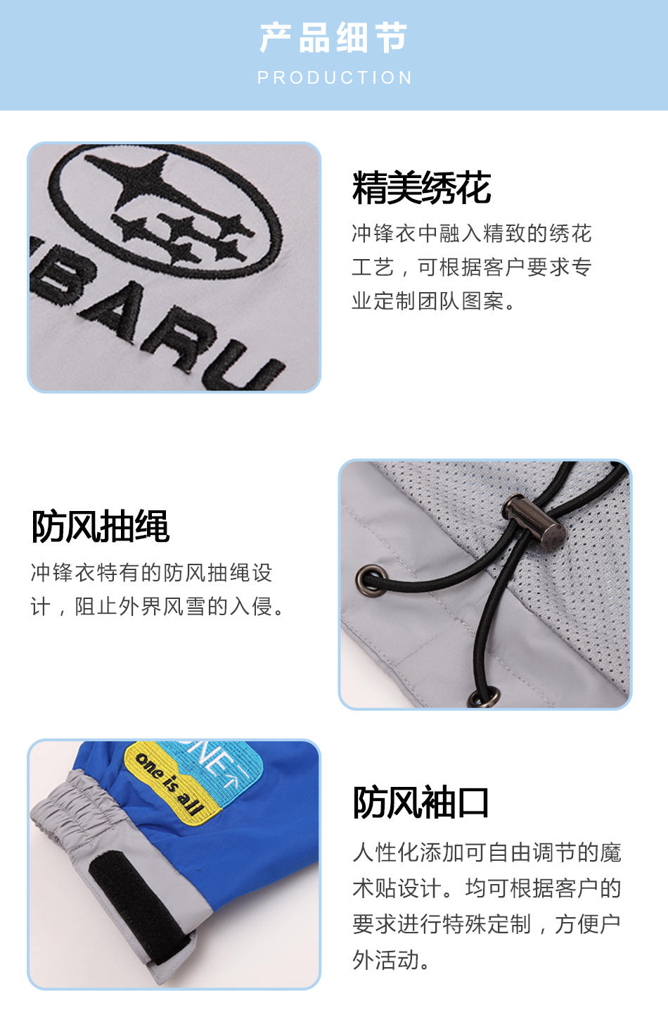 精美繡花:沖鋒衣中融入精致的繡花工藝,可根據(jù)客戶要求專業(yè)定制沖鋒衣團隊圖案。