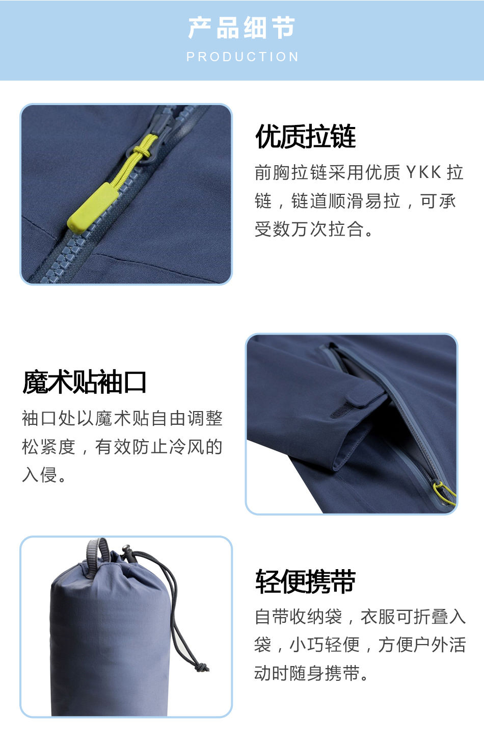 優(yōu)質(zhì)拉鏈:前胸拉鏈采用優(yōu)質(zhì)YKK拉鏈,鏈道順滑易拉,可承受數(shù)萬次拉合。