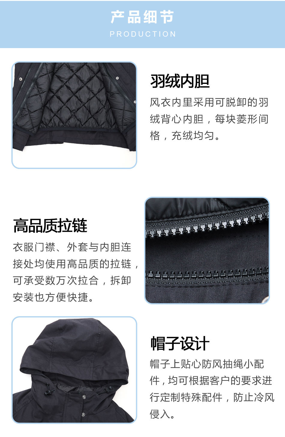 羽絨內(nèi)膽:風(fēng)衣內(nèi)里采用可脫卸的羽絨背心內(nèi)膽,每塊菱形間格,充絨均勻。
