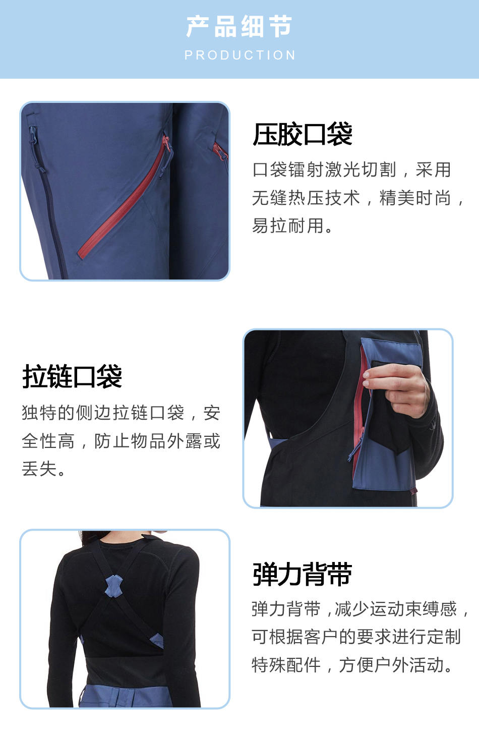 拉鏈口袋:戶外滑雪褲生產(chǎn)獨特的側(cè)邊拉鏈口袋,安全性高,防止物品外露或丟失。
