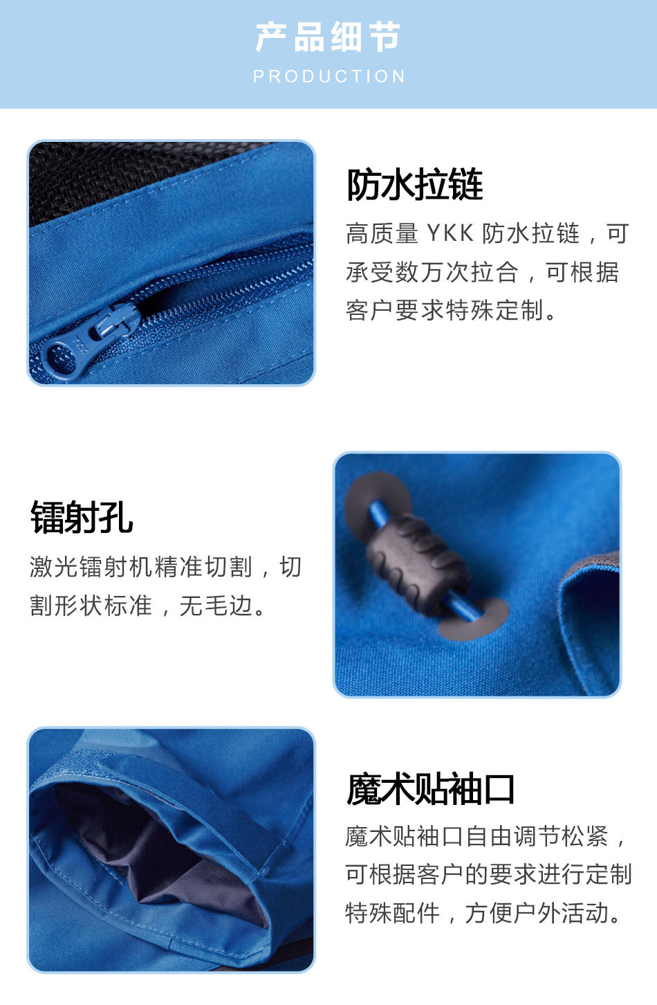 魔術(shù)貼袖口:魔術(shù)貼袖口自由調(diào)節(jié)松緊,可根據(jù)客戶的要求進(jìn)行定制特殊配件,方便戶外活動。