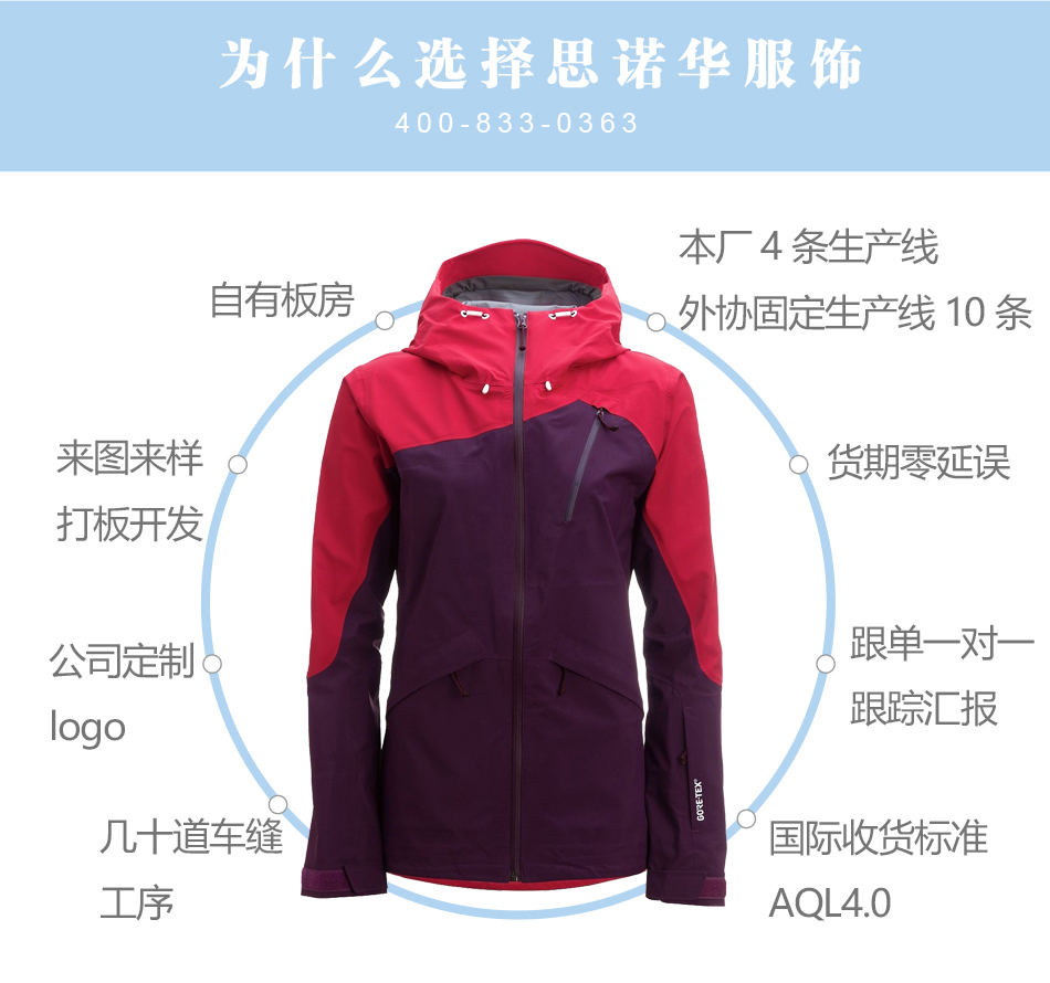 接縫壓膠:壓膠滑雪服生產采用優(yōu)質膠條,滑雪服每個接縫骨位壓膠,防止雨水滲入。