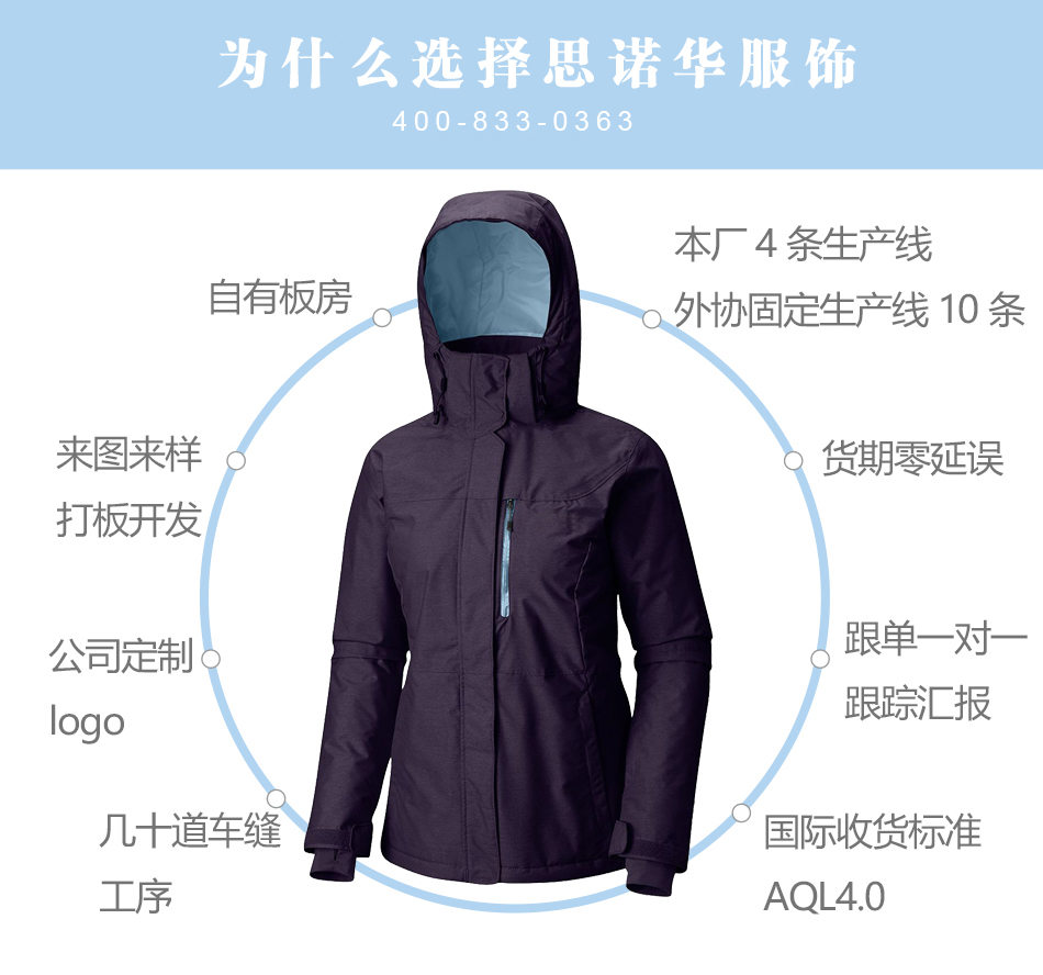 門襟處理:滑雪服生產(chǎn)的門襟進(jìn)行拉鏈和暗扣處理,可根據(jù)客戶的要求特殊定制,方便戶外活動(dòng)。